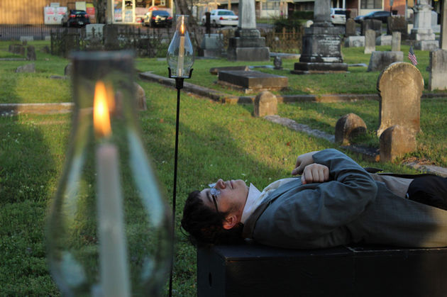 Senior Aiden Leise lays on a makeshift "tomb" as he waits for the next group of guests to arrive at his grave. Every year, thousands of guests flock to Friendship Cemetery in Columbus, Miss. to watch students perform as a presentation of the research they have conducted throughout the school year. The students choose their subject on their very first visit to the cemetery at the beginning of the school year.
